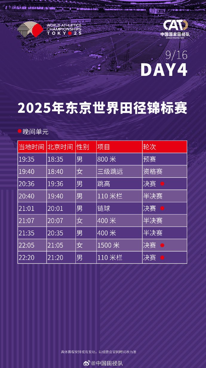 #2025东京田径世锦赛赛程# 中国田径队将派出73名运动员(男运动员41人、女运动员32人),参与田径世锦赛33个小项的比拼。